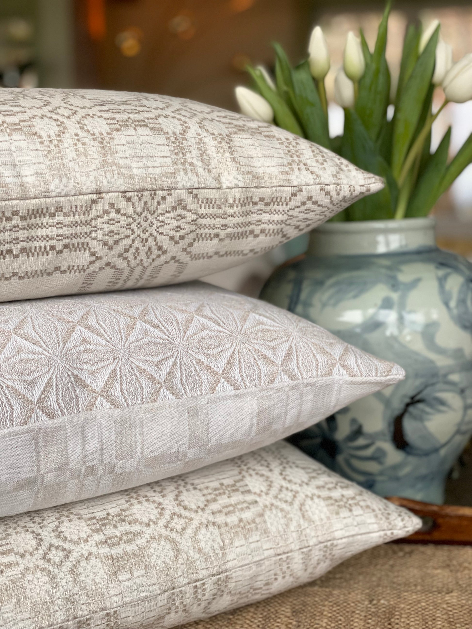 Hvert trekk er laget av nøye utvalgte, høykvalitets tekstiler, hentet fra nedlagte svenske veverier, sjeldne funn fra auksjoner, bruktmarkeder eller private samlinger. Vi gir disse materialene nytt liv gjennom redesign, og hvert putetrekk sys lokalt i Norge.